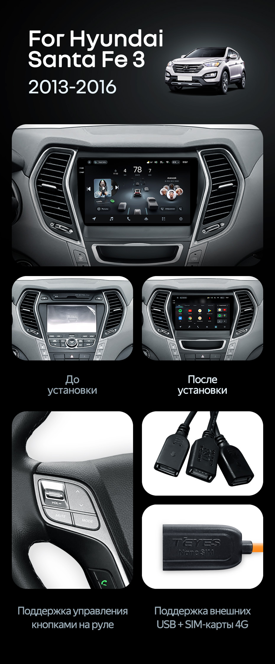 Штатная магнитола Teyes CC4 Pro 8/128 Hyundai Santa Fe 3 (2013-2016) Тип-B - купить всего за 59 120 руб. в интернет-магазине в Твери Teyes.com.ru. ✓ Самый лучший выбор мультимедиа ✓ Лучшая замена штатному ГУ ✓ Тел. +7 (800) 775-31-74