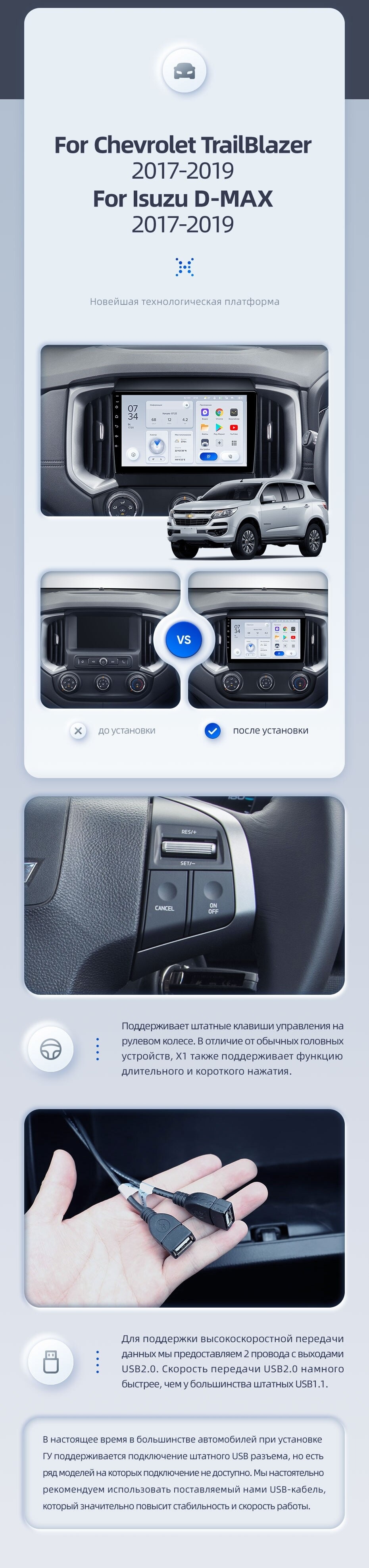 | USB | 3×USB 2.0 + USB 3.0 | Доп. аксессуары | Передняя/задняя AHD-камера, DVR-регистратор, TPMS, парковочный OBD, Type-C → HDMI |