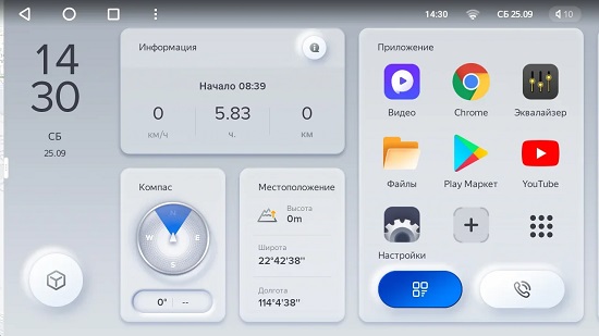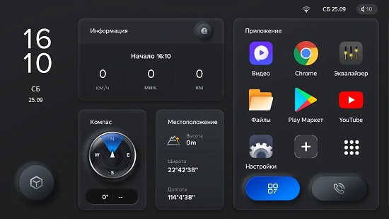 Бесшовный темный и светлый режимы. Экран не слепит ночью, а днем экран достаточно яркий. Определение дня или ночи производится в соответствии с включением света фар или временем восхода и заходя солнца. Для достижения визуального единства, переключение режимов происходит не только на главном экране, но и в остальных интерфейсах устройства. На главном экране можно переключать музыку в 4-х проигрывателях, просматривать данные о вождении, производить переход в приложения и прочее. А так же , изменять положения значков по всему желанию.